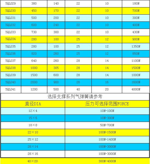 YQL支撑气弹簧规格表